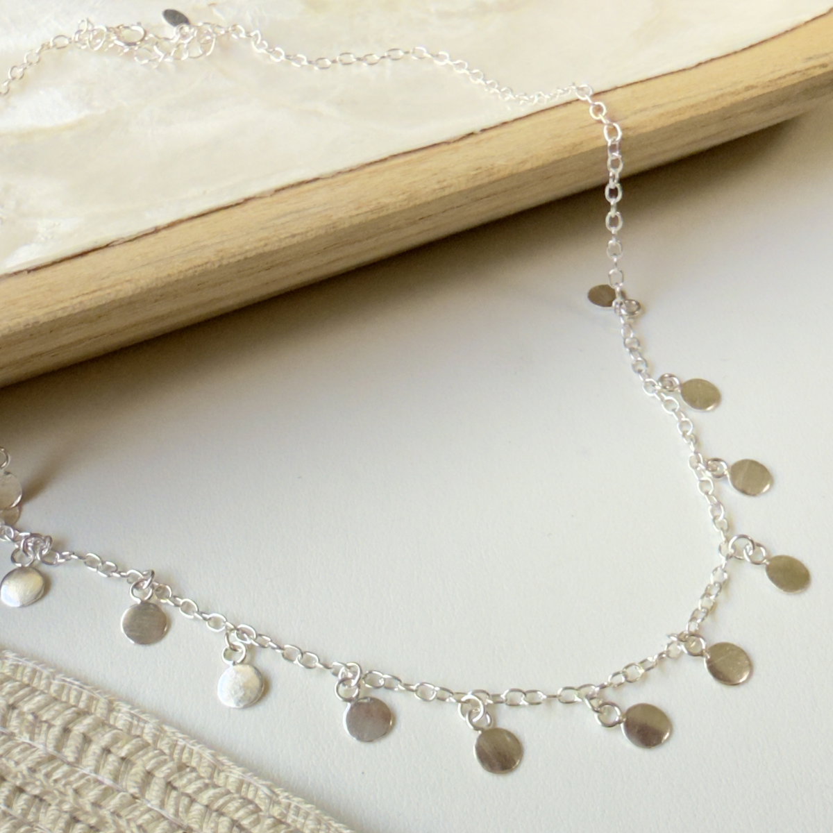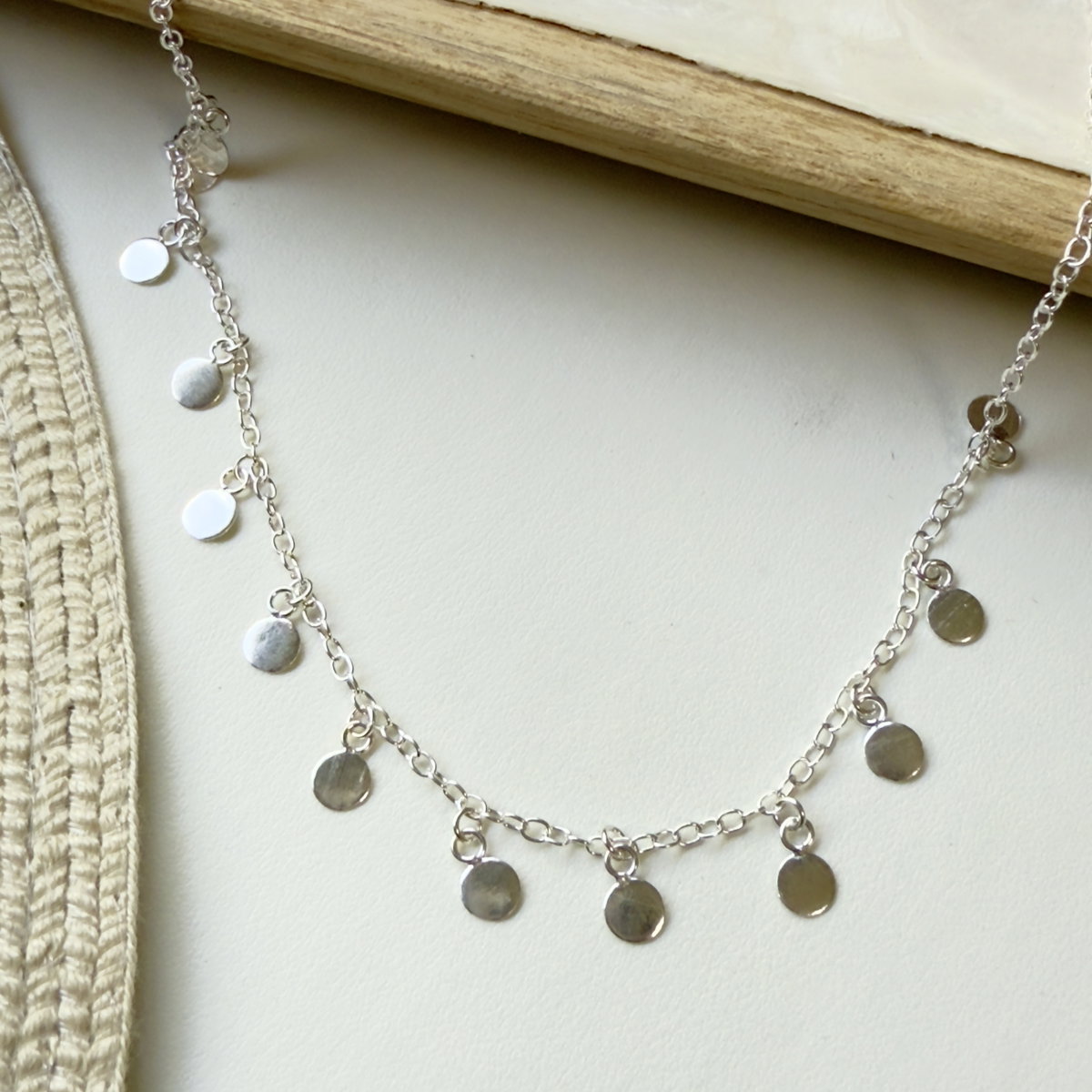 Collar confeccionado en plata 925 con cadena de eslabones finos adornada con pequeños discos de plata pulida, con un diseño minimalista boho lo convirten en la pieza perfecta para llevar sola o combinar en un "stack" de collares, como podemos ver en una de las fotografías.