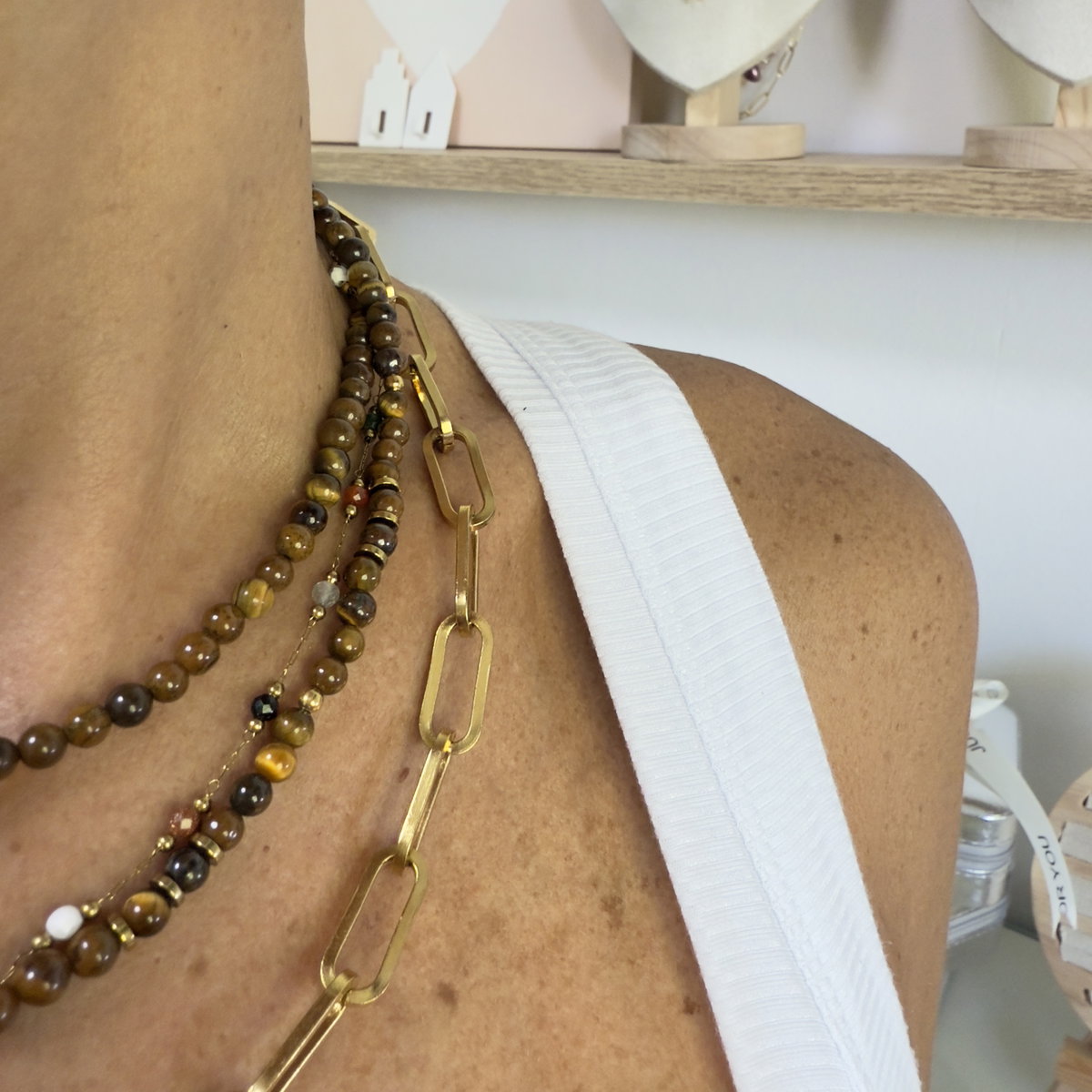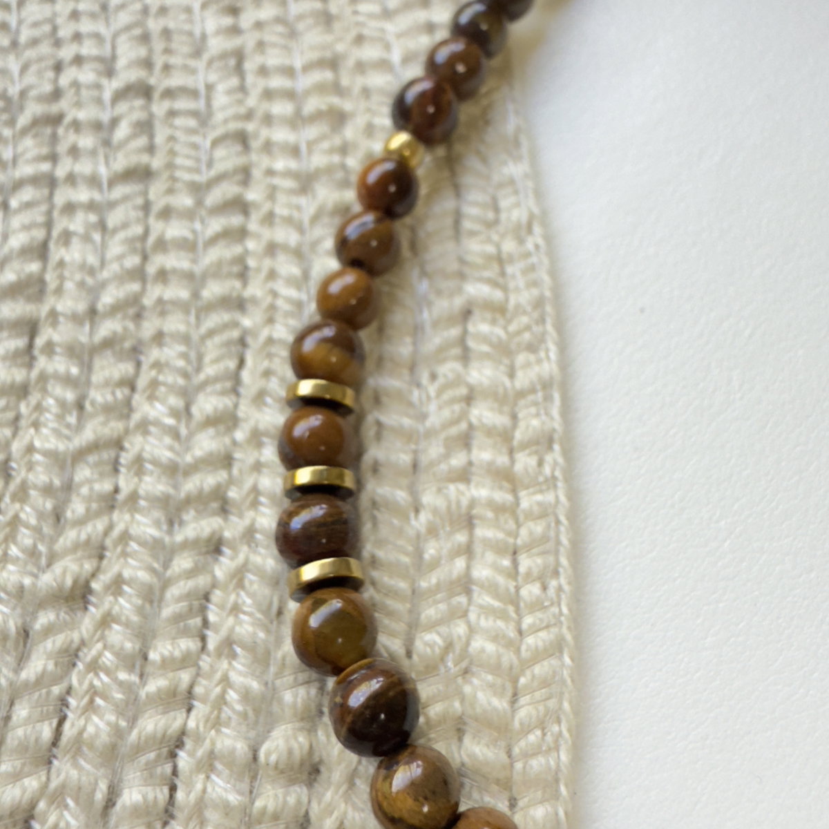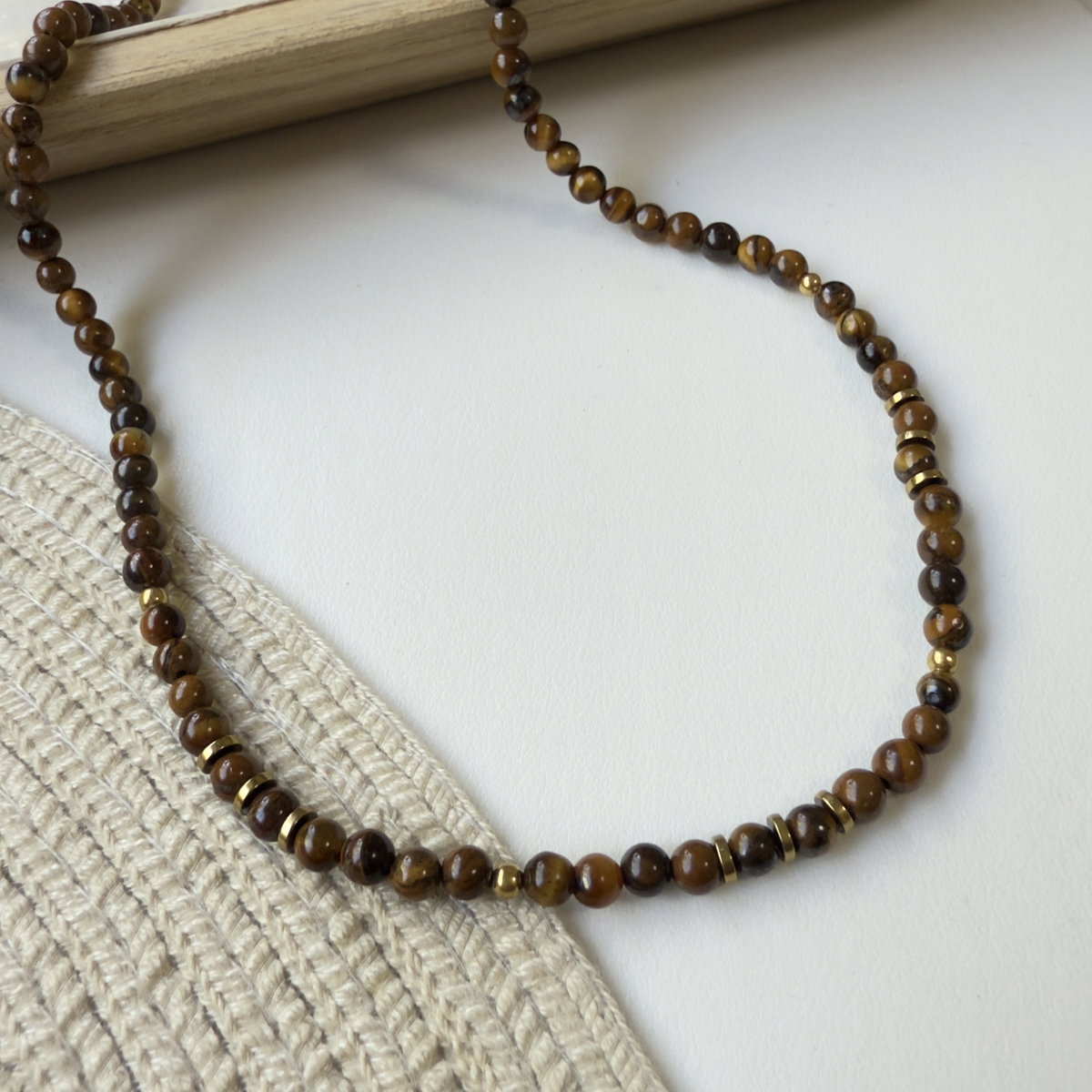 Collar confeccionado con piedras naturales, en este caso bolitas de ojo de tigre, con delicados detalles de bolitas en acero dorado y círculos de hematite dorado.