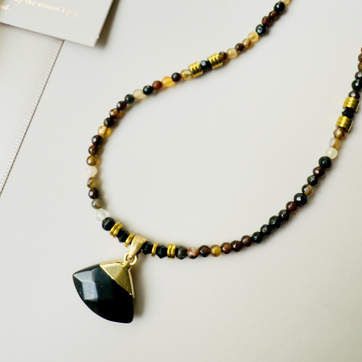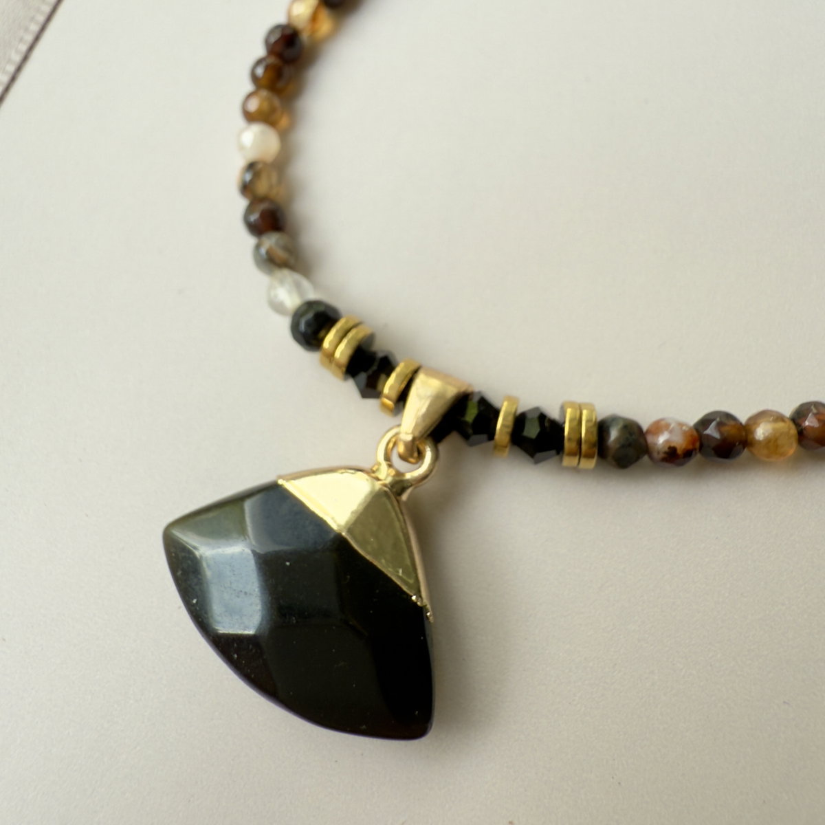 Collar confeccionado con bolitas de piedra naturales, ágatas en colores tierra y negro, con detalles de hematites dorados. En su frente y en el centro una piedra ónix con forma de triángulo