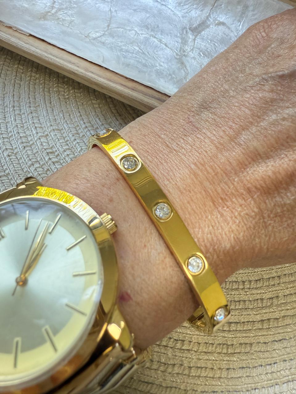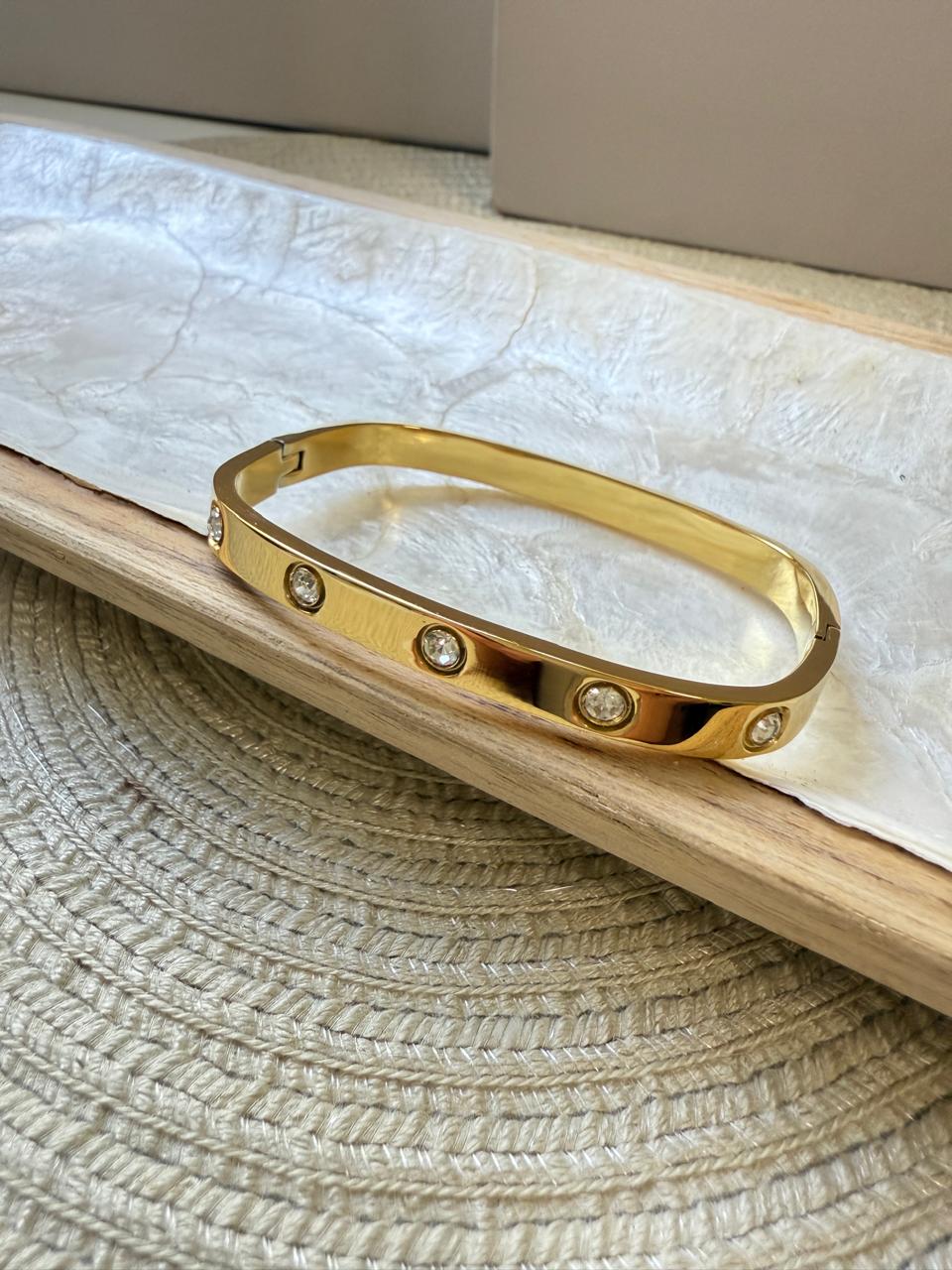 Esclava confeccionada en acero dorado, cuadrada con acabado pulido y 10 strass distribuidos en 2 de los lados de la pulsera.