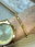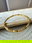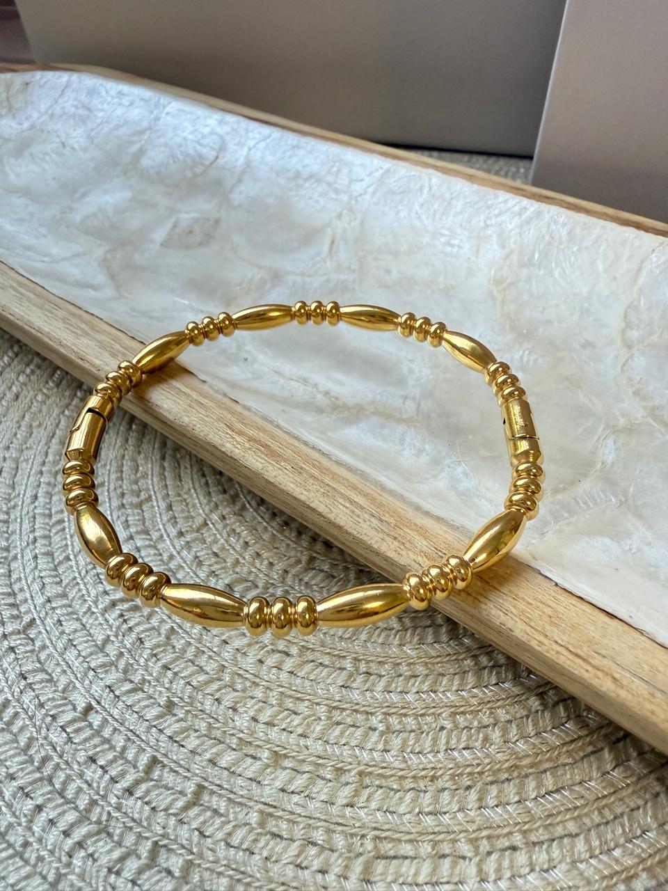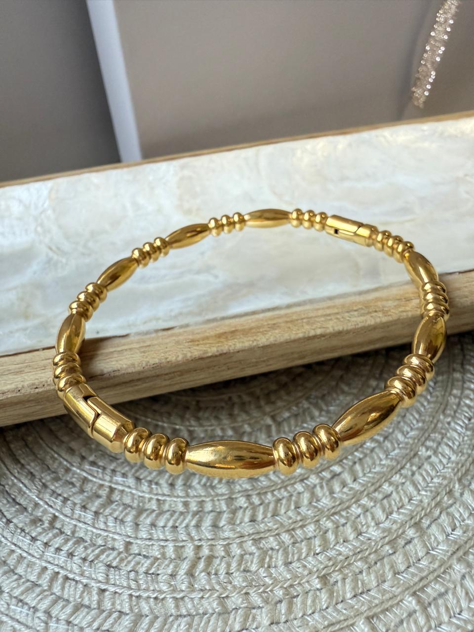 Esclava confeccionada en acero dorado, que combina un diseño de figuras ovales y pequeñas arandelas con terminbacion pulida. Su cierre es clip con bisagra