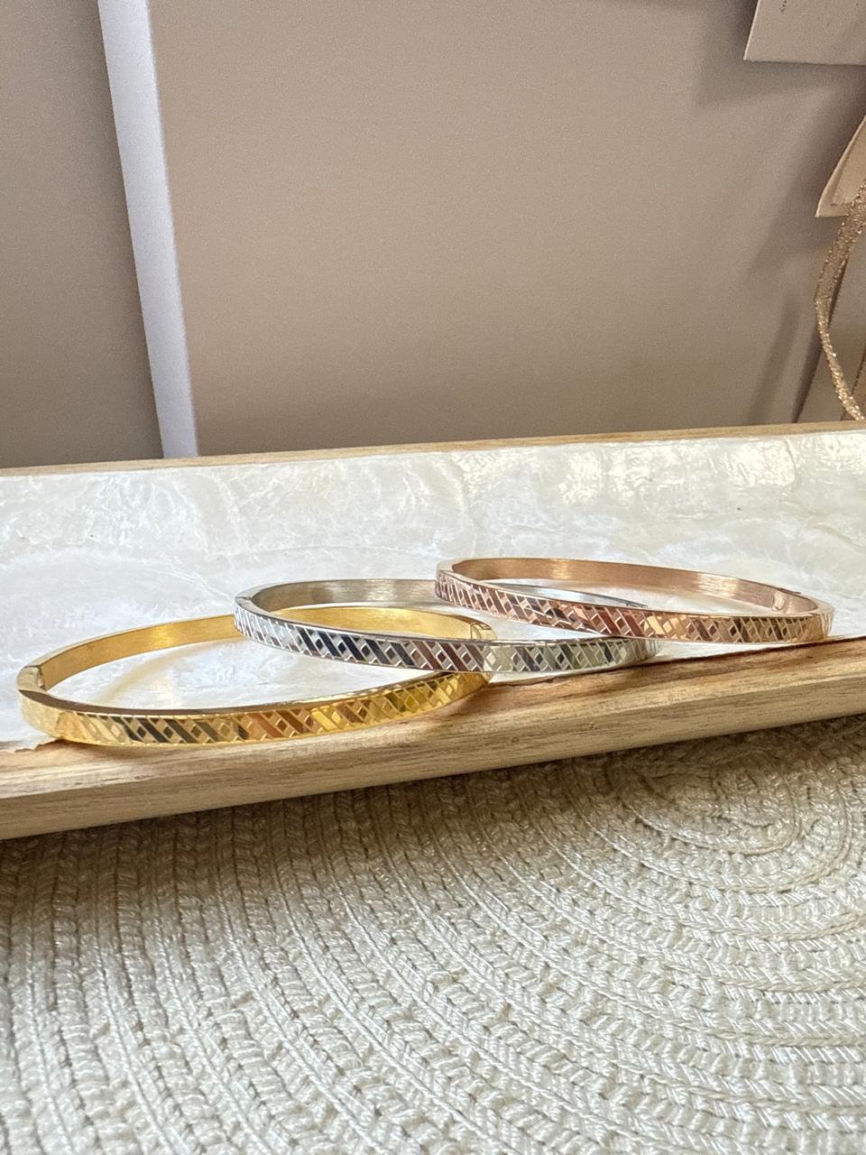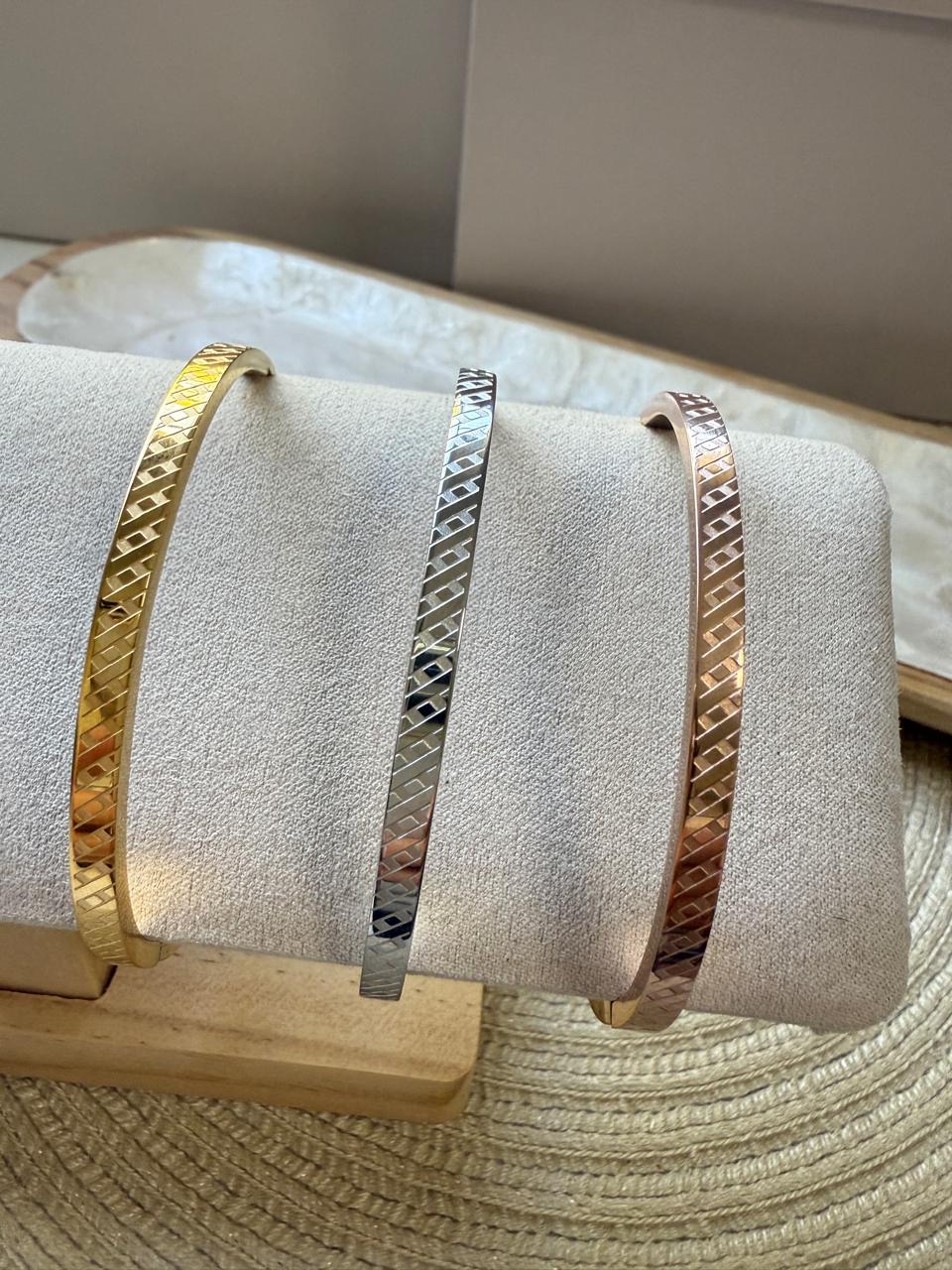 Set de 3 esclavas confeccionadas en acero dorado, rosé y plateado,con forma oval , con dibujo libre de diagonales , combinando acabado pulido y arenado. El cierra de las mismas es clip con bisagra