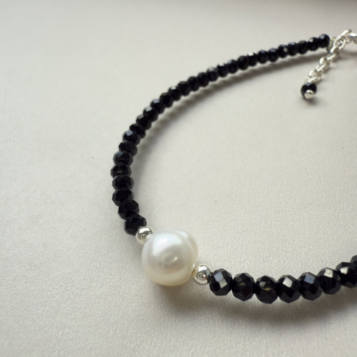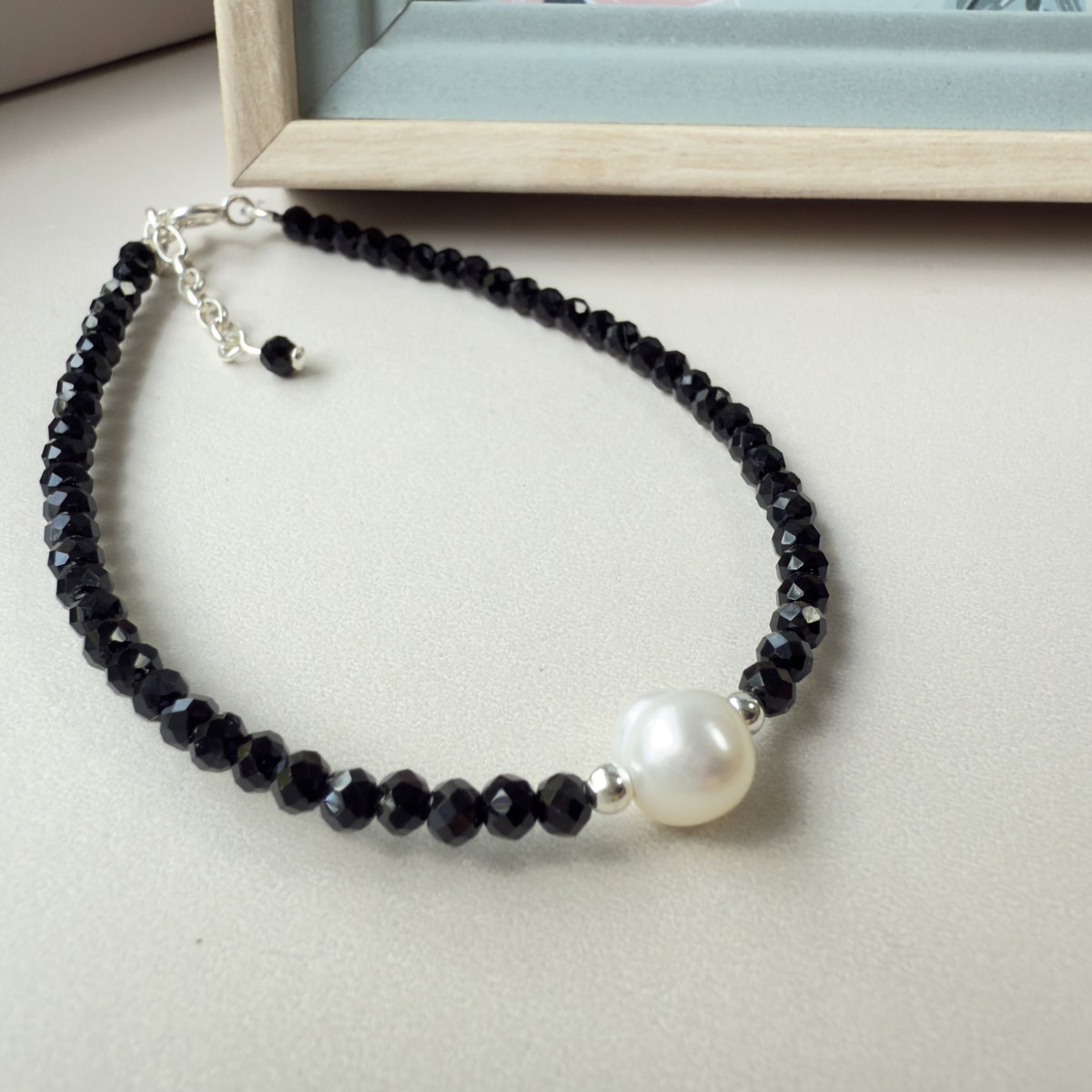 Pulsera confeccionada con cristales checos y perla de rio central con detalles de delicadas bolitas de plata a ambos lados. El cierre y el alargue que termina con un pequeño cristal negro son de plata 925.