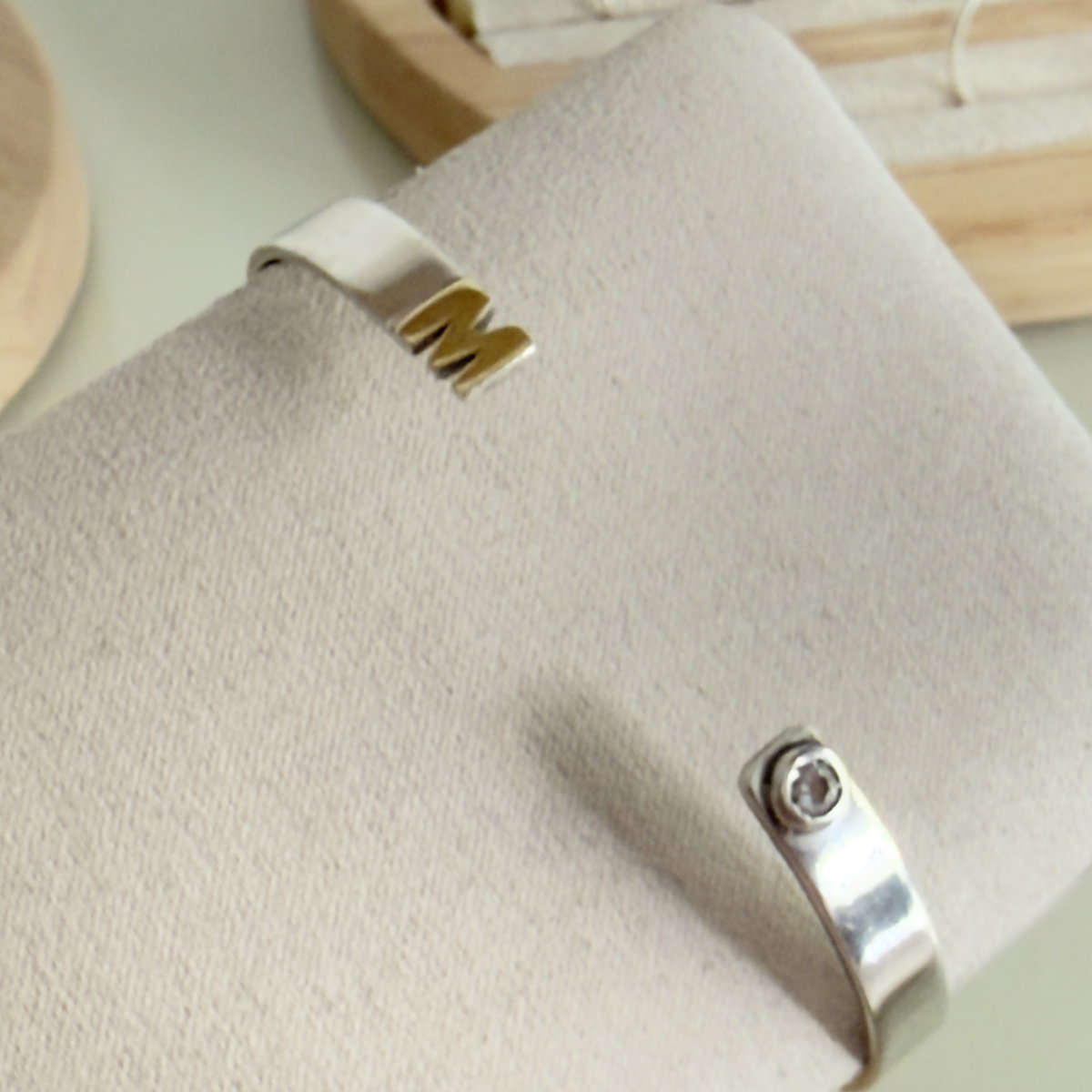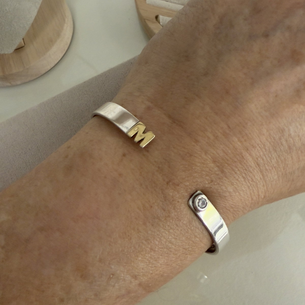 Pulsera tipo media esclava con la inicial que elijas en un extremo y en el otro un cubics circon en el color que especifiques. Confeccionada en plata 925 con inicial en duble de oro 18k.