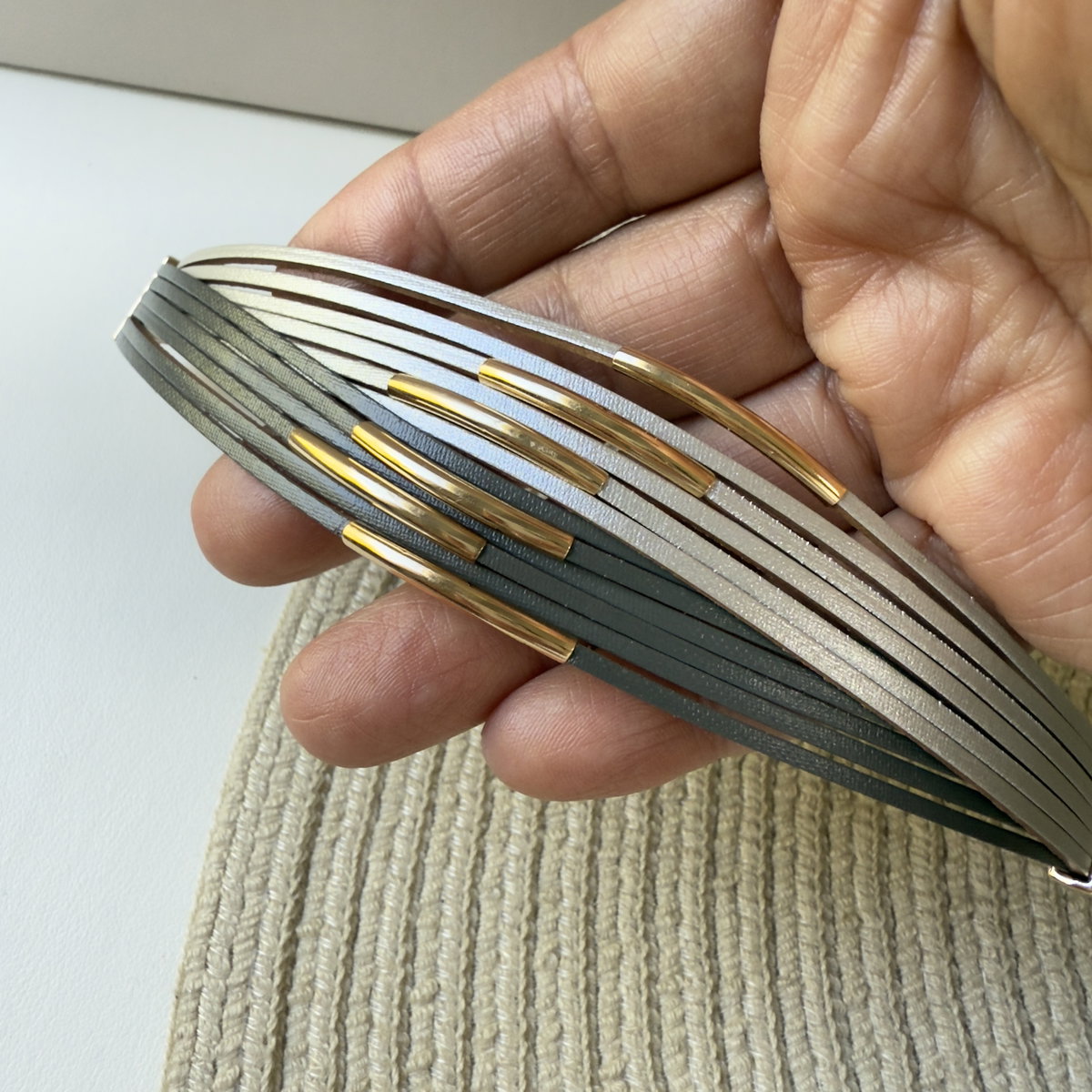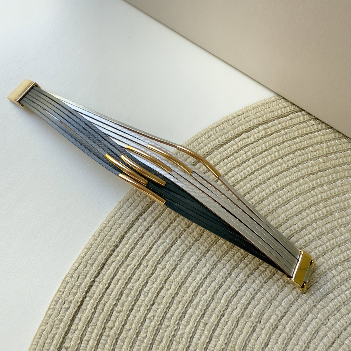 Pulsera realizada en una audaz combinación de tiras finas en ecocuero en color platino y negro con detalles de tubos dorados/rosé en algunas de esas tiras. Los extremos están rematados por cierres magnéticos también en color dorado/rosé