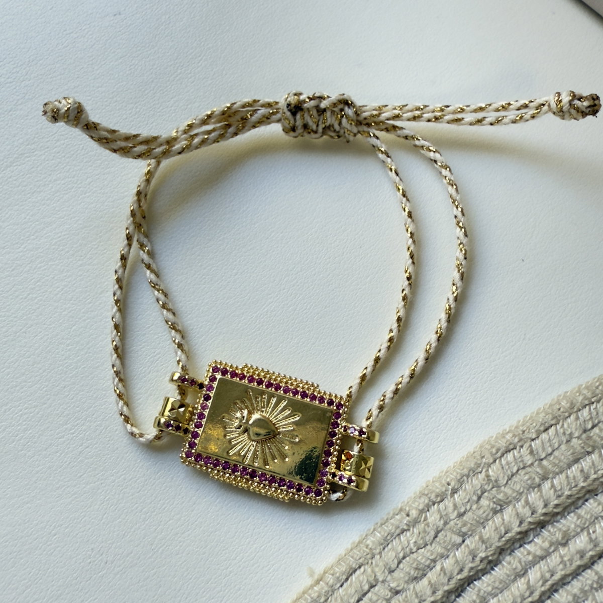 Pulsera realizada con un cordón trenzado color natural y dorado. El centro de la pulsera es una medalla rectangular en aleacion balada en oro 18, con un borde de micro-pavé en tono rubí intenso. En su interior, presenta una imagen del Sagrado Corazón, con llamas y rayos radiantes. El cierre de la pulsera es tejido macramé ajustable