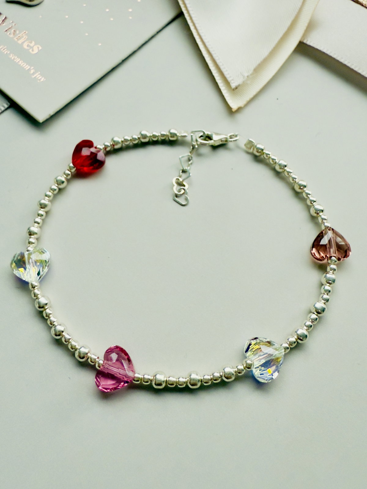 Pulsera realizada en plata 925 que entrelaza bolitas de plata de distintos tamaños y dijes pasantes en forma de corazón realizados en cristal austriaco en color rojo,rosa y blanco tornasol (aurora boreal)